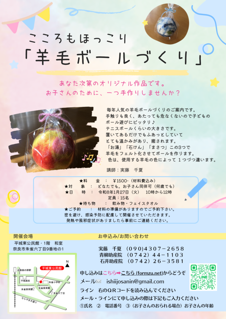 こころもほっこり「羊毛ボールづくり」 / 未分類 / By admin あなた次第のオリジナル作品です。お子さんのために 、 一つ手作りしませんか?講師:実藤 千夏 料金 :¥1,000-(材料費込み)対象 :どなたでも。お子さん同伴可(何歳でも)日時 :令和8年1月27日(火)10時から12時定員 :15名持ち物 :飲み物・フェイスタオル☆ご予約 :材料の準備がありますのでご予約ください。(発熱や風症状がありましたら、事前にご連絡ください) ↑詳しくはチラシをご覧ください。